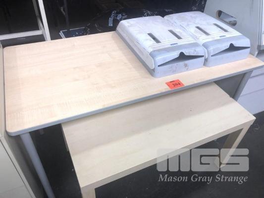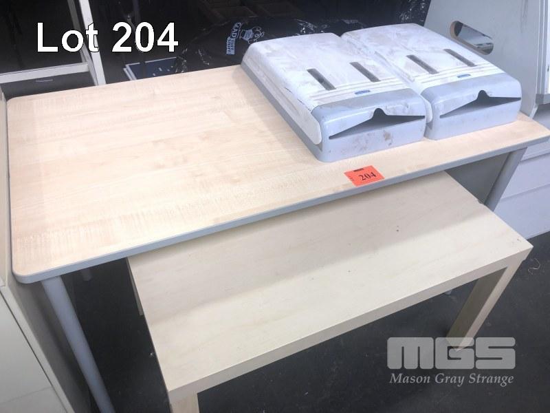 WORK TABLE, STEEL FRAME, LAMINATE TOP, 1200 x 600mm WITH LAMINATE COFFEE TABLE, 900 (L) x 550 (D) x 450mm (H) & 2 x PAPER TOWEL DISPENSERS