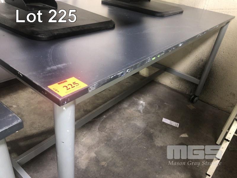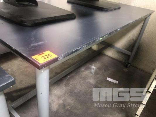 WORK TABLE, DARK GREY TIMBER LAMINATE TOP, 1800 x 900mm ON STEEL FRAME WITH PAIR CASTORS, 1 END