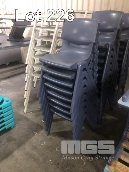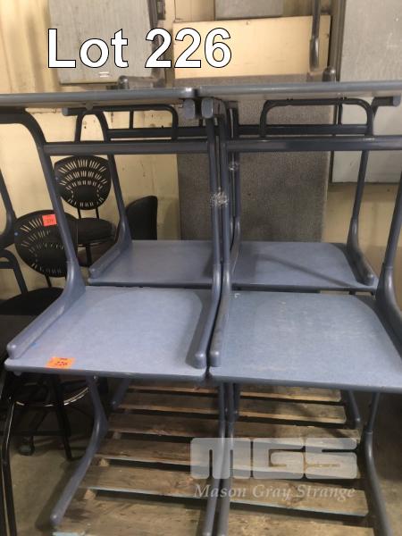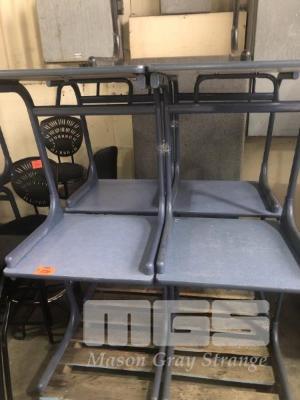 9 x STUDENTS DESKS. STEEL FRAME, LAMINATE TOP, 600 x 600 x 725mm (H), BLUE/GREY WITH 9 x SEBEL PLASTIC STUDENTS CHAIRS