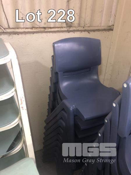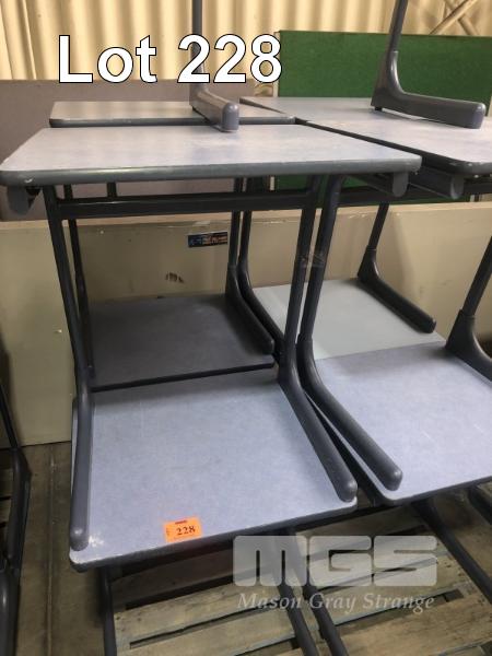 9 x STUDENTS DESKS. STEEL FRAME, LAMINATE TOP, 600 x 600 x 725mm (H), BLUE/GREY WITH 8 x SEBEL PLASTIC STUDENTS CHAIRS