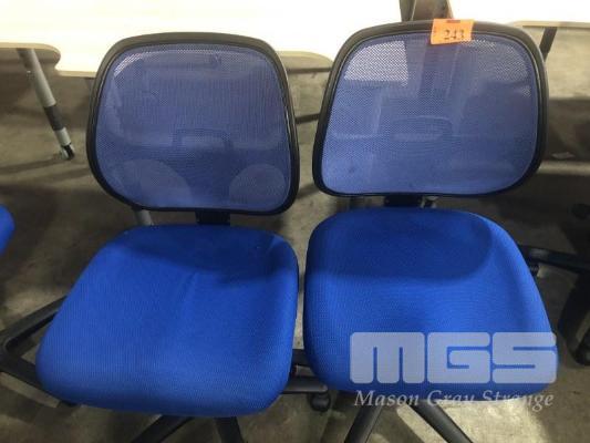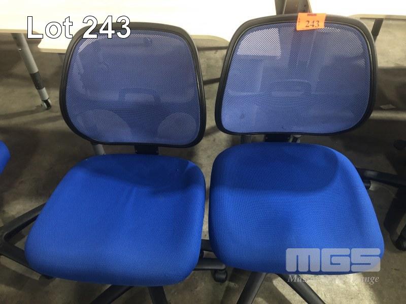 2 x GAS LIFT BLUE ON BLACK STUDENTS CHAIRS, MOBILE, CLOTH BASE, MESH BACK