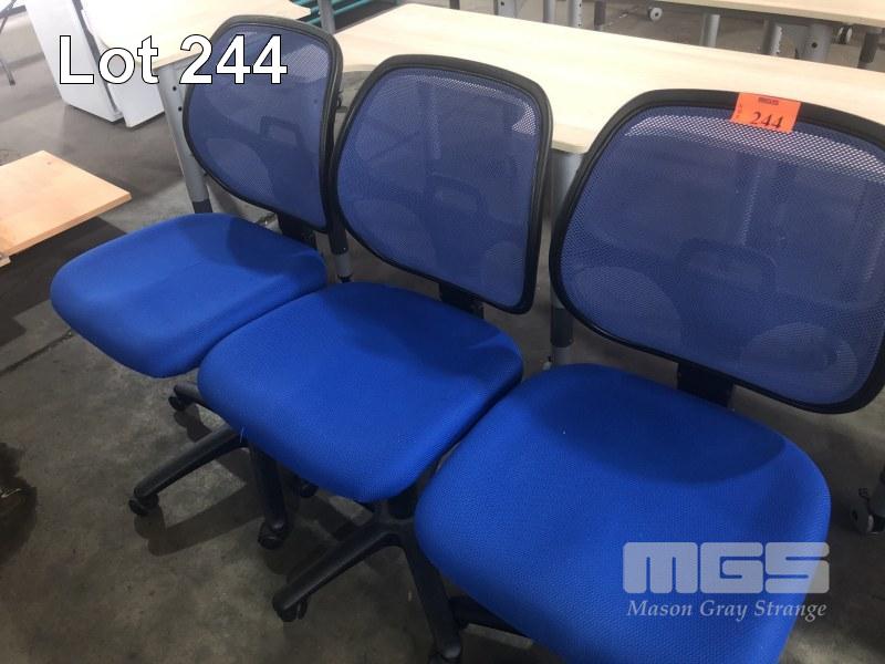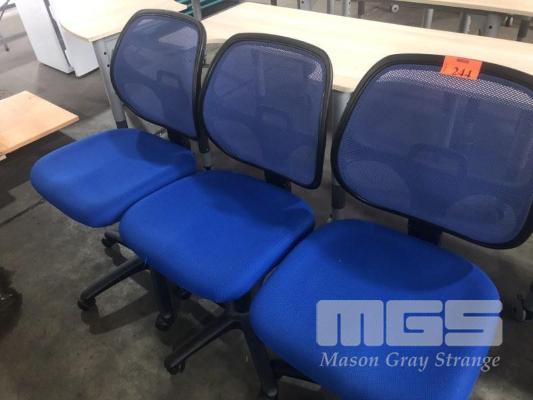 3 x GAS LIFT BLUE ON BLACK STUDENTS CHAIRS, MOBILE, CLOTH BASE, MESH BACK