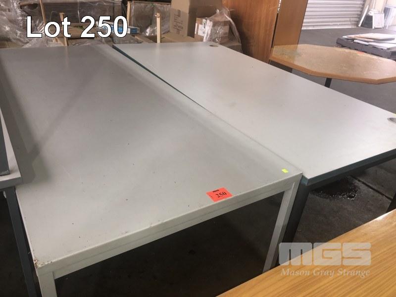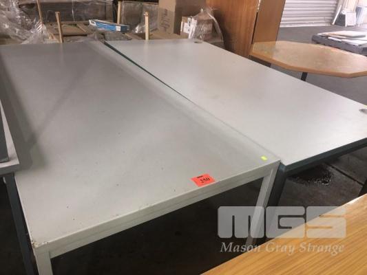PAIR WORK TABLES, GREY TIMBER LAMINATE, STEEL FRAME, 2100 x 900mm & 2100 x 1000mm