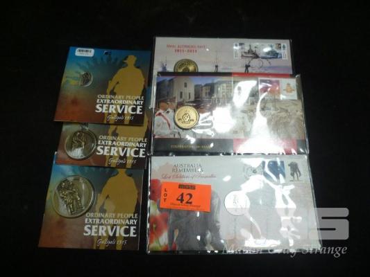 3 X MILITARY FIRST DAY COVERS WITH COMMEMORATIVE COINS, GALLIPOLI MEDALION, PIN & KEYRING