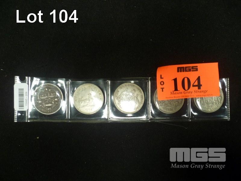 5 X ASSORTED AUSTRALIN FLORINS IN 1927 PARLIMENT HOUSE & 1954 ROYAL VISIT COMMEMORATIVE FLORINS