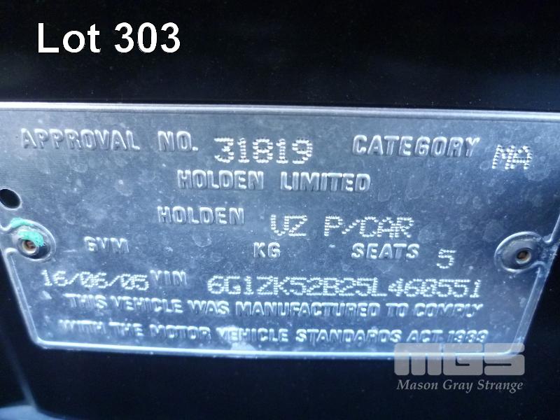 2005 HOLDEN COMMODORE VZ SEDAN REG: XHN-834 (SA) (EXPIRED) VIN: 6G1ZK52B25L460551 ENG: HBAH051580216 ODO: 262,507 KM 6 CYLINDER, 4 SPEED AUTOMATIC, PETROL, BLUE, 4 DOORS, 5 SEAT, AIR BAG, AIR CON, ALLOY WHEELS, CD PLAYER, CENTRAL LOCKING, CRUISE CONTROL, POWER STEERING, POWER WINDOWS, SPARE WHEEL, TOW BAR (WITH PAPERS, WITH 2 KEY/S, WITH OWNER'S MANUAL, WITH SERVICE BOOKS) CONDITION: FRONT/REAER BUMPER - PAINT FADED/PEELING