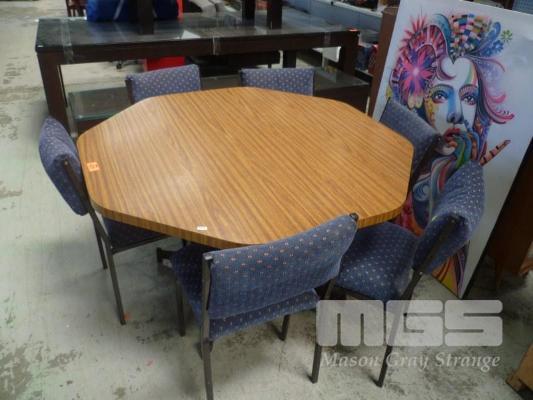 RETRO 7 PIECE DINING SUITE, INC HEXAGONAL TIMBER LAMINATE TABLE, SINGLE PEDESTAL, 6 x METAL FRAMED CHAIRS, BLUE FABRIC, (SOME STAINED, 1 x DAMAGED)