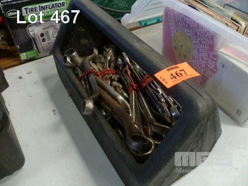 PLASTIC TOOL CADDY & CONTENTS OF ASSORTED HAND TOOLS, MAINLY SPANNERS