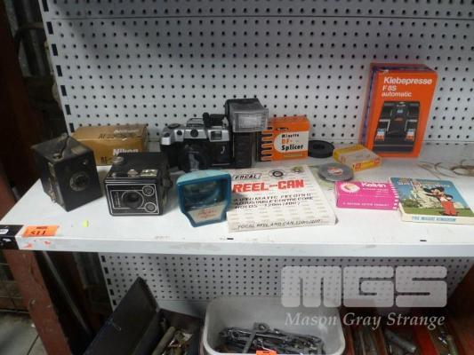 COLLECTION OF FINTAGE CAMERAS & REEL TO REEL LOT, INCL BROWE CAMERAS, WALT DISNEY THE MAGIC KINGDOM IN BOX