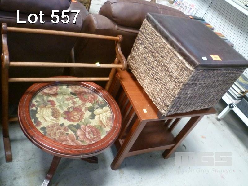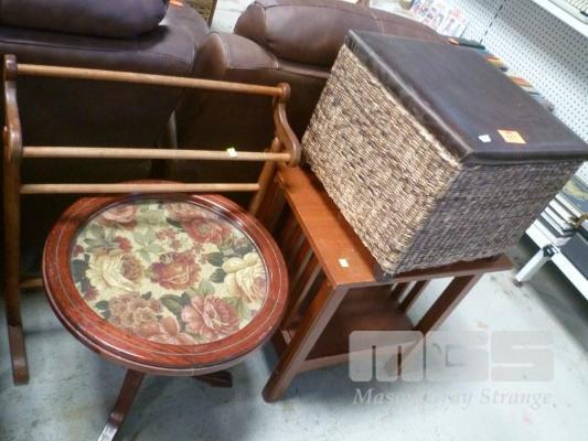 TIMBER ROUND OCCASIONAL TABLE, TAPESTRY INLAY TIMBER CLOTHES AIRER, SIDE TABLE & SEAGRASS VINYL POUFFE