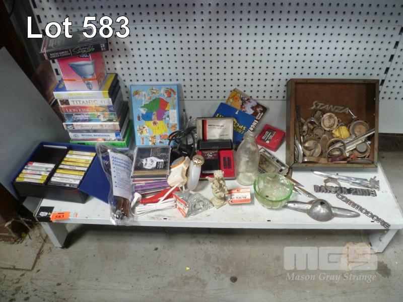 COLLECTION OF CAR BADGES, VIDEOS, CASSETTE TAPES, DEPRESSION GLASS, CDs, ETC.