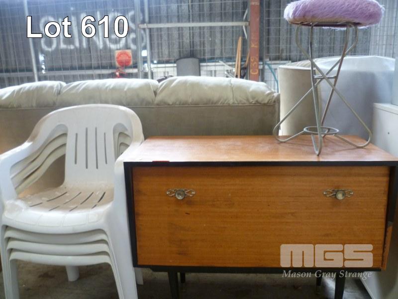 RECORD CABINET & 4 x PLASTIC OUTDOOR CHAIRS