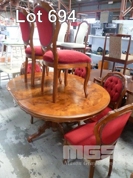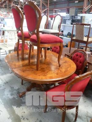 TIMBER 7 PIECE DINING SUITE, INC; OVAL EXTENSION DINING TABLE, SINGLE PEDASTAL, MARQUETRY INLAY & 6 X TIMBER, BALLOON BACK, DINING CHAIRS, RED VELVET FABRIC