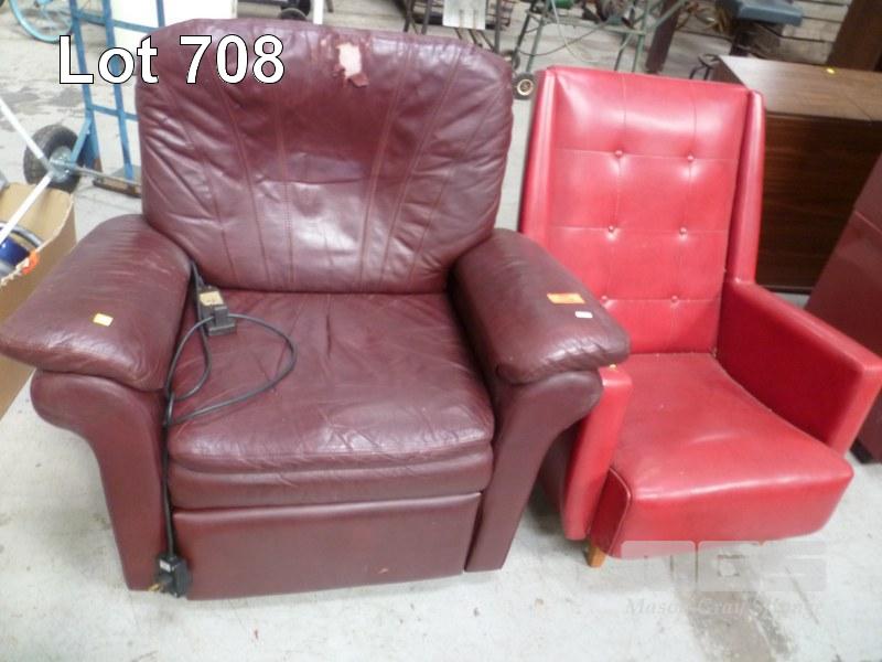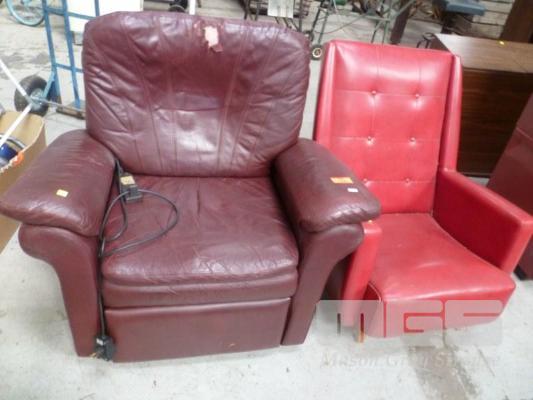 BURGUNDY LEATHER ELECTRIC RECLINER, (TORN) & RED VINYL ARM CHAIR