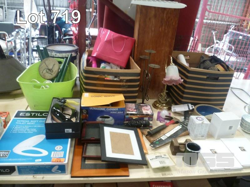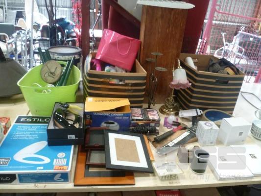 ASSORTED CLEANING PRODUCTS, COAT HANGERS, PICTURE FRAMES, DVDs, ETC. (1 x TABLE)