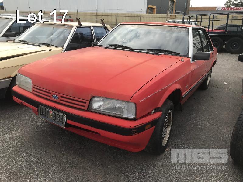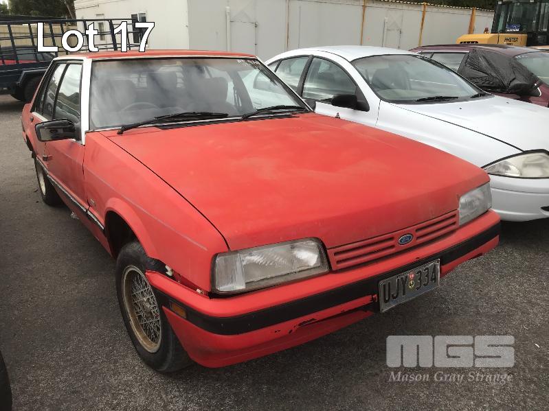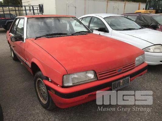 1987 FORD XF FALCON GL SEDAN REG: UJY 334 (SA) VIN: JG23HU75032 ODO: 192,938 kms SHOWING 4.1 LITRE 6 CYLINDER, 3 SPEED AUTO, PETROL, RED, 4 DOORS, 5 SEAT, AIR CON, ALLOY WHEELS, POWER STEERING, TOW BAR (NO PAPERS, NO KEYS, NO OWNER'S MANUAL, NO SERVICE BOOKS) CONDITION: EXTERIOR - EXTENSIVE RUST INTERIOR - FILTHY ENGINE - NO ENGINE, HEAD BLOCK ONLY LOCKS - DRIVERS & BOOT LOCK REMOVED