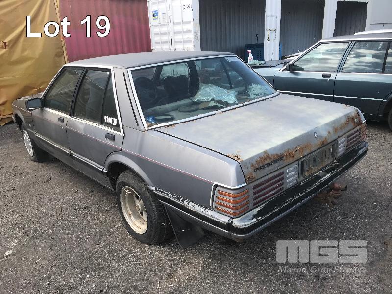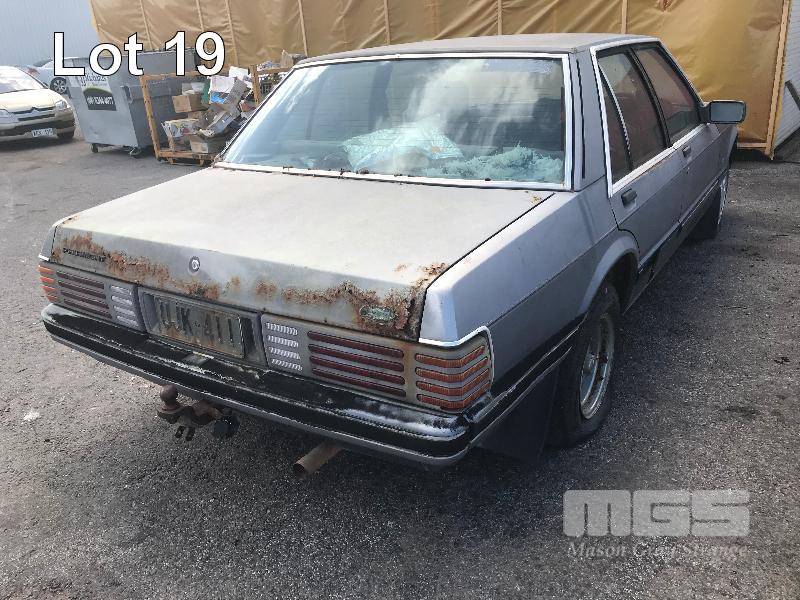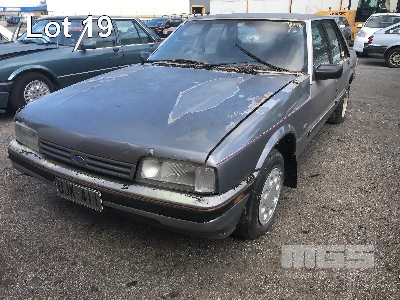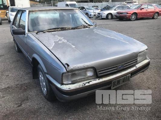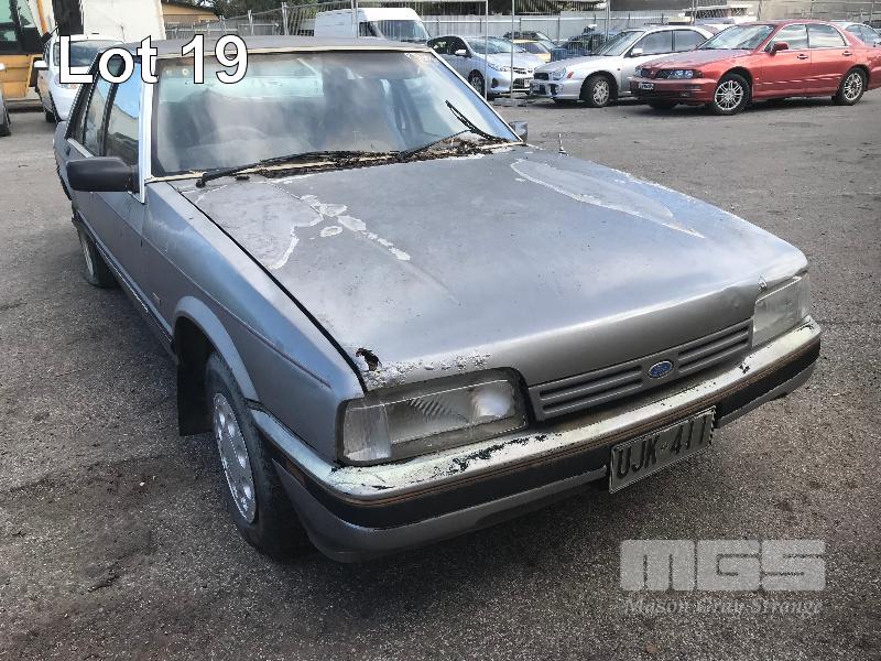 1987 FORD XF FAIRMONT SEDAN REG: UJK 411 (SA) VIN: JG34HT57028C ODO: 405,607 kms SHOWING 4.1 LITRE 6 CYLINDER, 3 SPEED AUTO, PETROL, GREY, 4 DOORS, 5 SEAT, POWER STEERING, TOW BAR, PAIR OF SPEEDY CHROME MAG WHEELS TO REAR (NO PAPERS, NO KEYS, NO OWNER'S MANUAL, NO SERVICE BOOKS) CONDITION: BODY - EXTENSIVE RUST, POOR CONDITION INTERIOR - POOR CONDITION