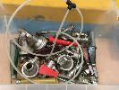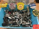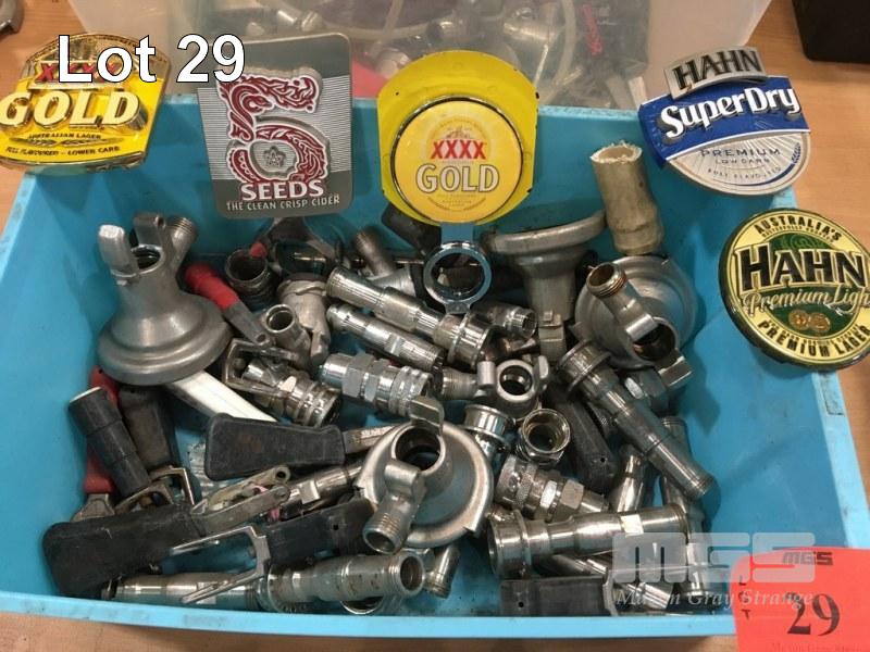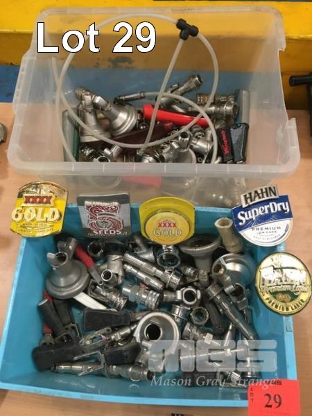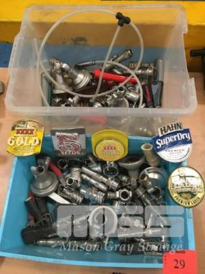 8 x BEER KEG TAPS, MICROMATIC, WIHT ASSORTED BEER PLAQUES INC XXX GOLD, HAHN SUPERDRY. ETC, FITTINGS & HANDLES, 2 x TUBS