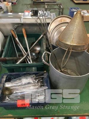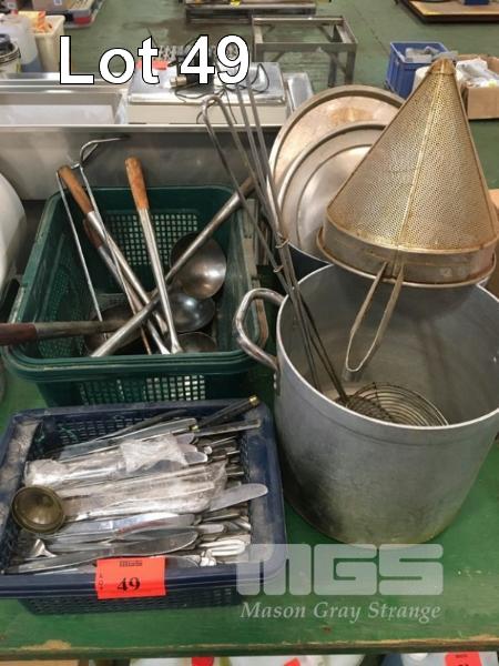 LARGE QUANTITY DINNER KNIVES, POTS, SIEVE, SOUP LADELS, ETC
