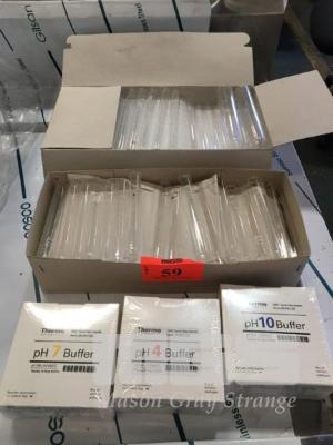 LAB TEST TUBES, SCHOTT FIOLAX 2 x BOXES OF 100, ASSORTED SIZES & 3 x BOXES THERMO SCIENTIFIC PH BUFFER, 10, 7 & 4