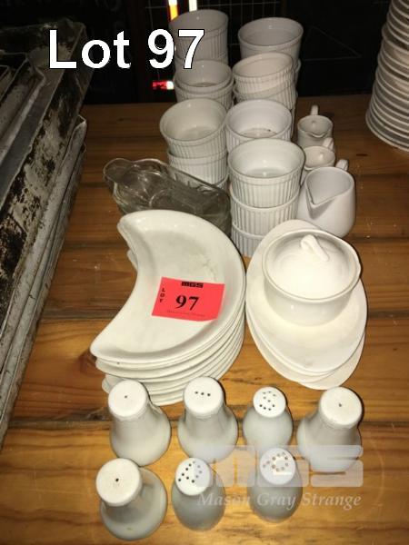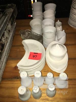 22 x ASSORTED WHITE PORCELAIN RAMEKINS, 7 x ASSORTED SLAT & PEPPER SHAKERS, MOON SHAPED PLATES, MILK JUGS, ETC