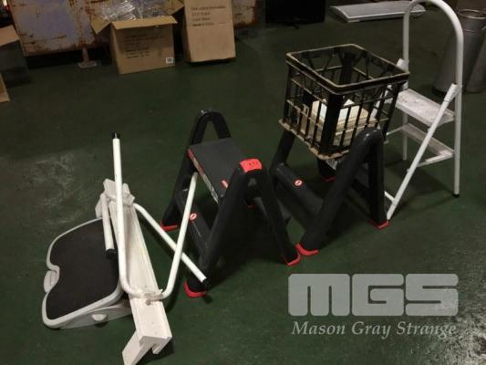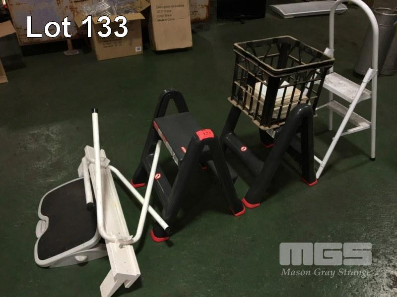 2 x PLASTIC & 1 x METAL STEP LADDERS, HORSE STAND, ETC