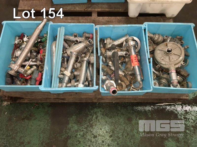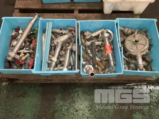 STAINLESS STEEL PUMP & TANK FITTINGS, SUIT BEVERAGE INDUSTRY, INC VALVES, JOINERS, REDUCERS, ETC, 4 x TRAYS