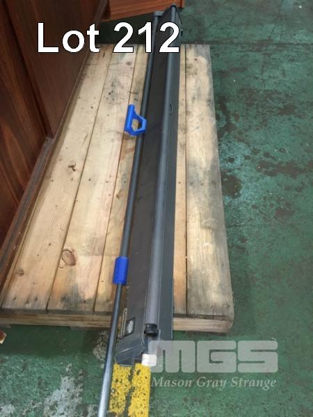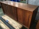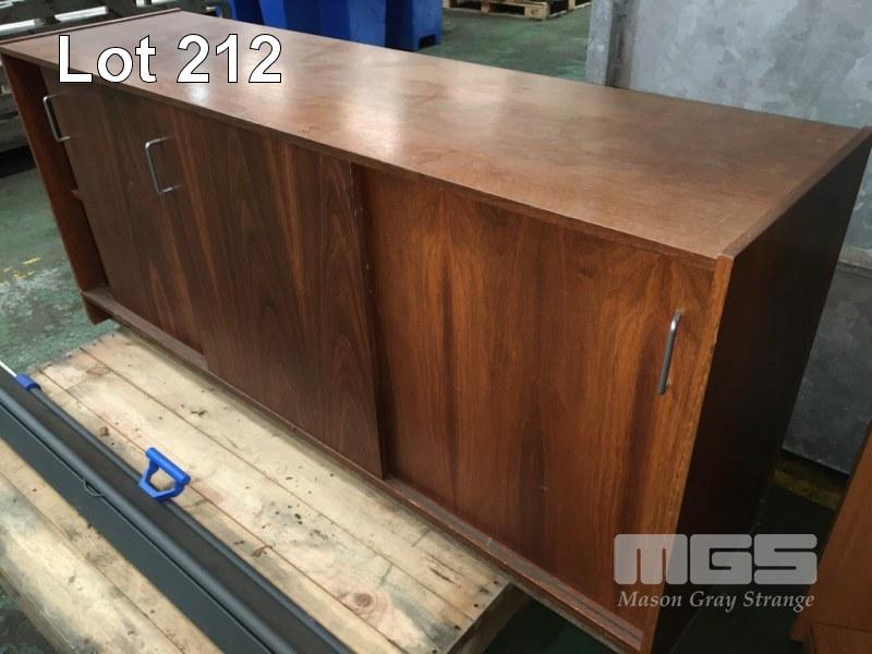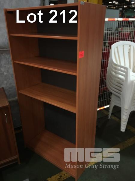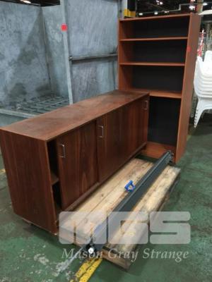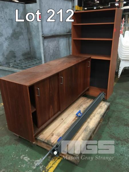 SHELF UNIT, GREY & TIMBER LAMINATE, 5 TIER, 900 x 450 x 1800mm (H), TIMBER LAMINATE CREDENZA, 3 SLIDING DOORS, 1800 x 500 x 800mm (H) & RETRACTABLE SCREEN, DELTA SCREEN, 1700mm, ALL FAULTS