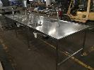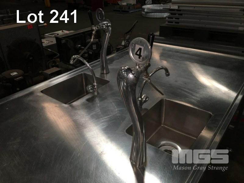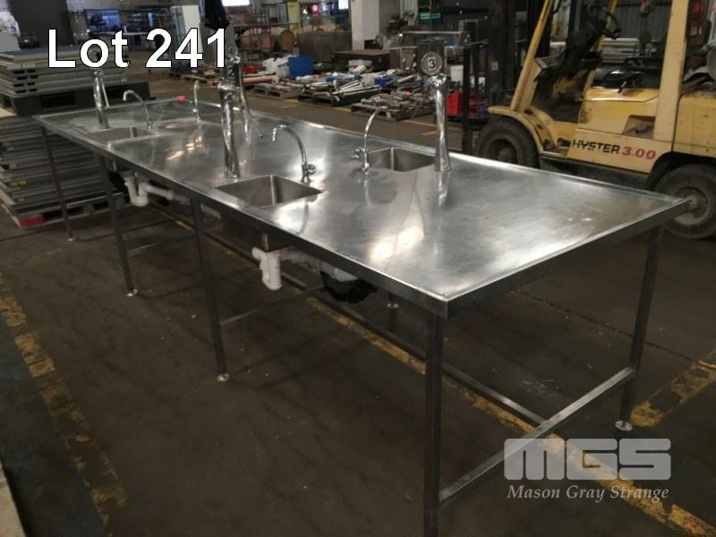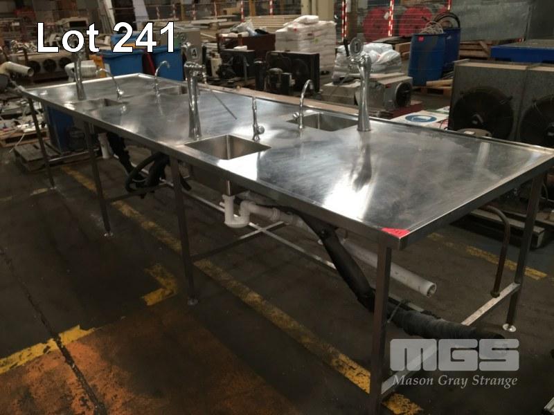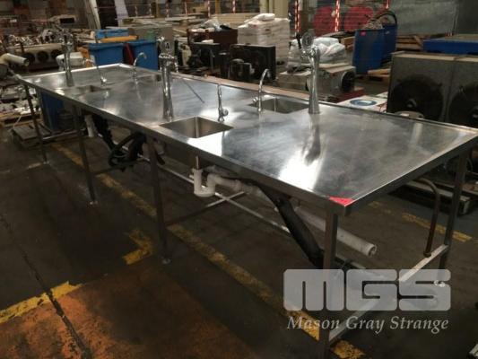BOTTLE FILLING STATION BENCH, 4300 x 1200mm, ULTIMA FLOW LTD COMPRISING 4 x STATION FILLING BENCH WITH SINK, TAP WATER OUTLET & POURER/FONT HEAD, ANNEDALE FITTINGS & PVC DRAIN WORK