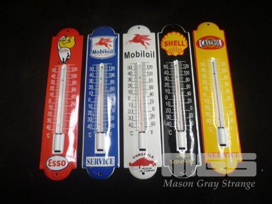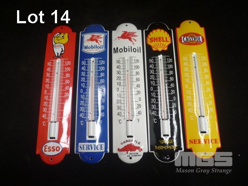 5 x RE-MADE ENAMEL THERMOMETERS INC SHELL, MOBILOIL, CASTROL & ESSO