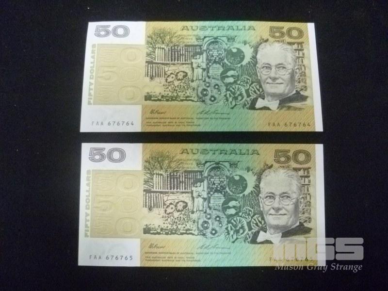 1993 2 X 50 DOLLAR 1ST PREFIXS "FAA" NOTE CONSECUTIVE FRAZER EVANS