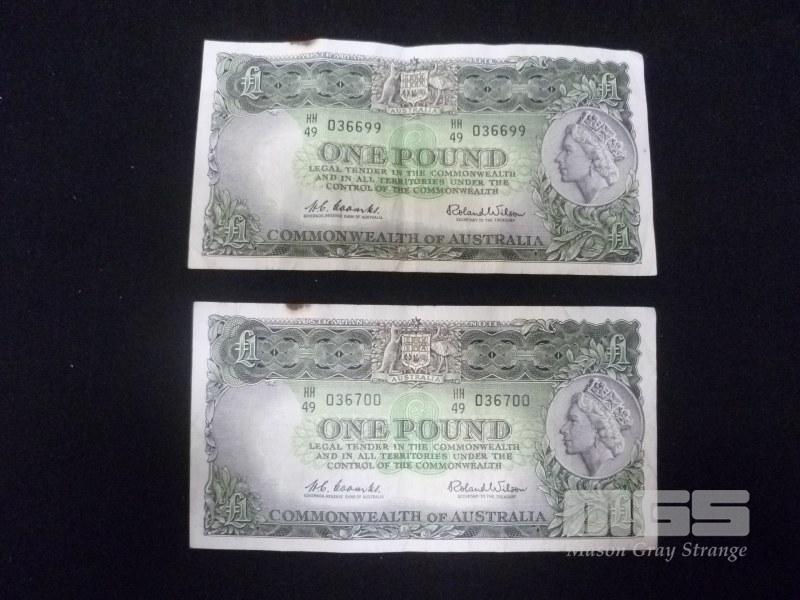 1960 2 X 1 POUND NOTE CONSEC COOMBS WILSON MARK TOP OF NOTES