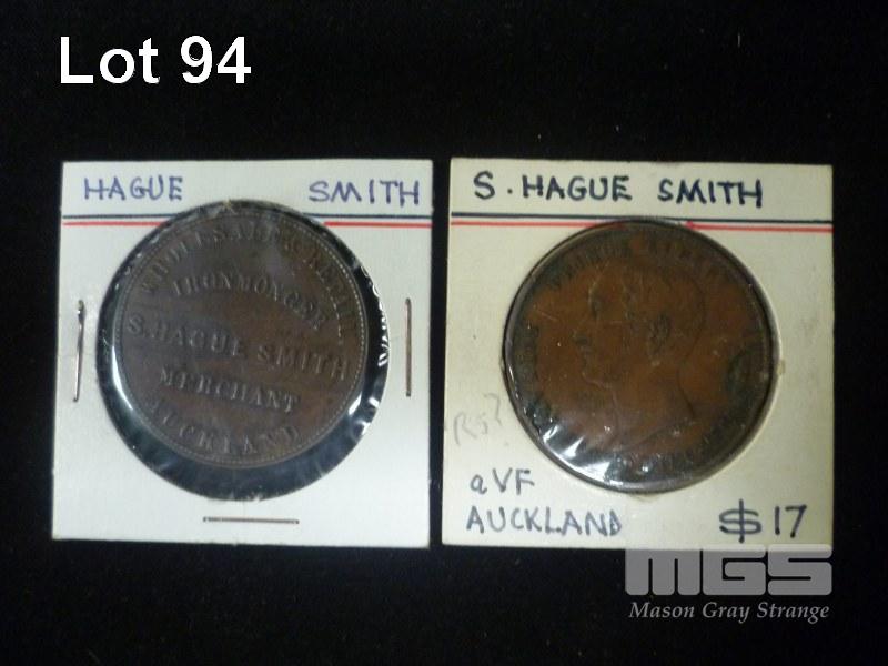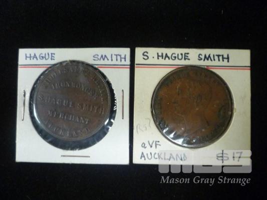 2 X PENNY TOKENS, S.HAGUE SMITH, AUCKLAND, WHOLESALE & RETAIL, IRONMONGER MERCHANT, PRINCE ALBERT