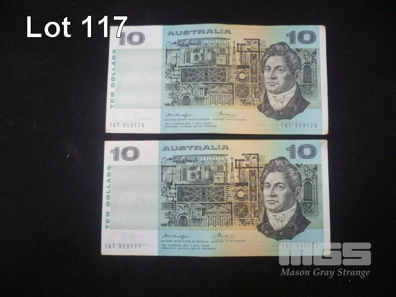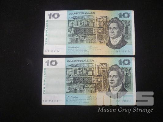 1976 2 X 10 DOLLAR NOTE CONSECUTIVE " GOTHIC" SIDE THREAD VF