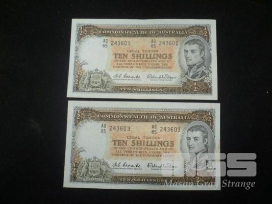 2 X COMMONWEALTH OF AUSTRALIA, TEN SHILLINGS, BANKNOTES, COOMBS/WILSON, AG85 243603, AG85 243603