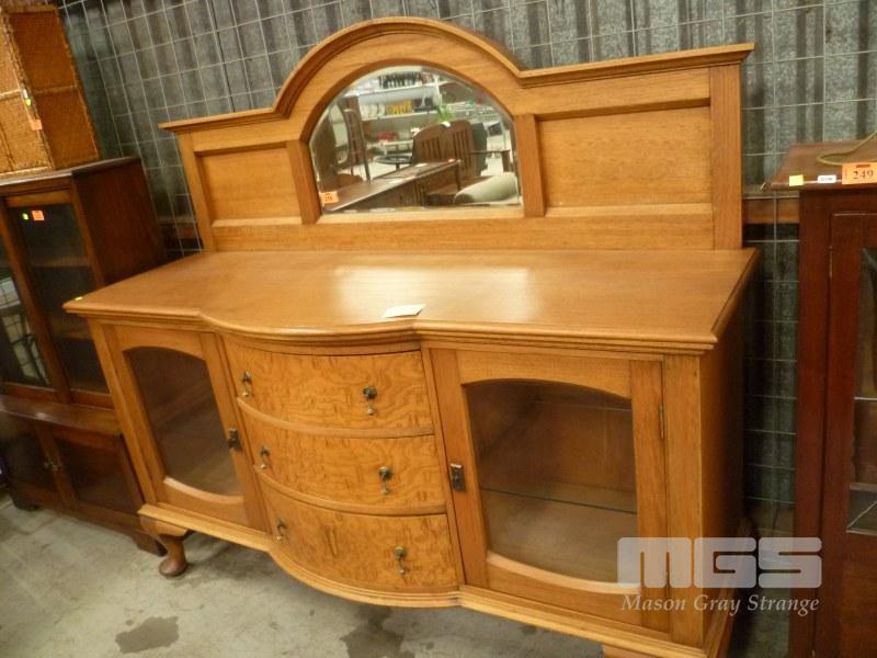 AUSTRALIAN OAK SIDEBOARD, ARCHED FRONT WITH 2 GLASS FRONTED DOORS & 3 DRAWERS, BEVELLED EDGE MIRROR TO BACK PANEL