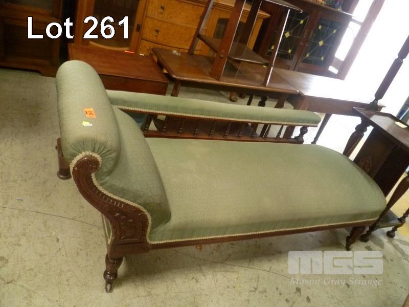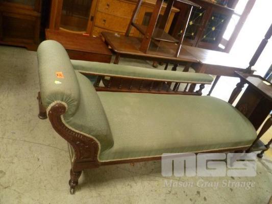 VINTAGE CHAISE LOUNGE, ORNATE CARVED, PORCELAIN CASTORS, GREEN FABRIC