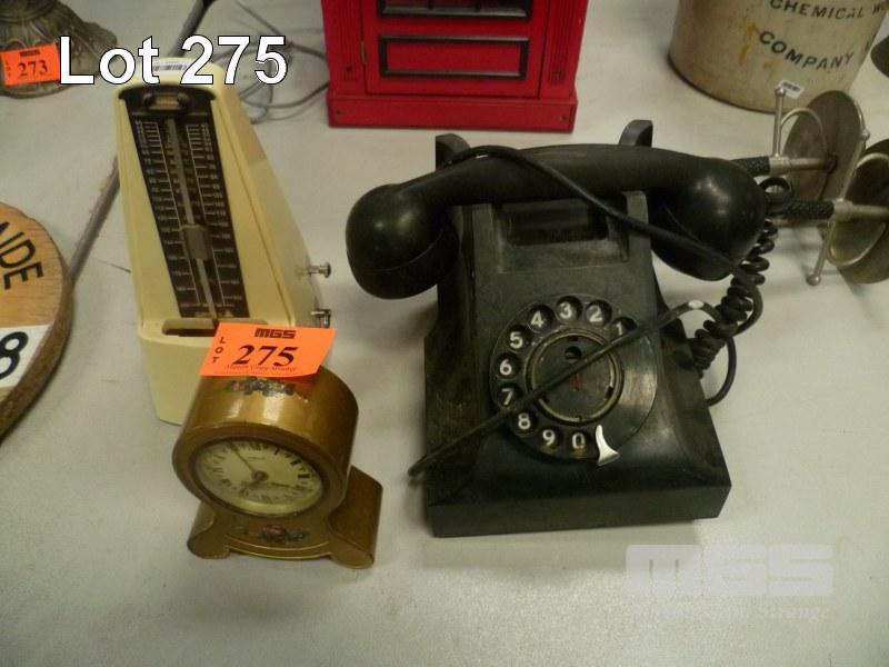VINTAGE BLACK BAKELITE DIAL TELEPHONE, SAMICK METRONOME & FABRIK SSS MUSICAL MANTLE CLOCK