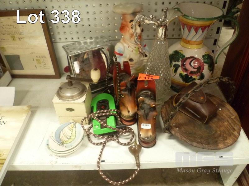ASSORTED RETRO INC ANODIZED CUPS, PLASTER HORSE BOOK ENDS, CLARET JUG, ETC