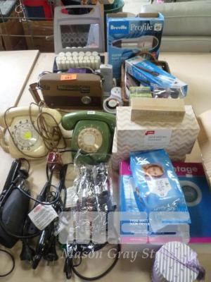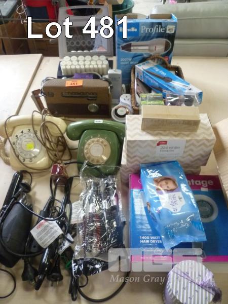2 x RETRO DIAL TELEPHONES, PORTABLE RADIO, HAIRDRESSING ITEMS