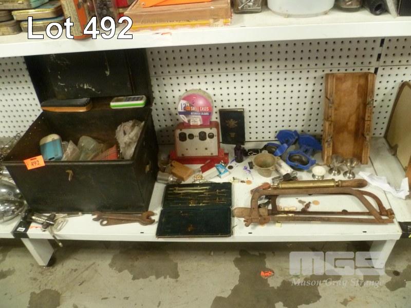 ASSORTED VINTAGE TOOLS, TOOL BOX, SAW,S DRAFT KIT, ETC