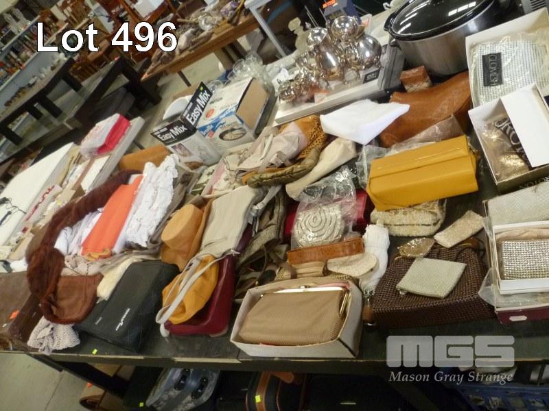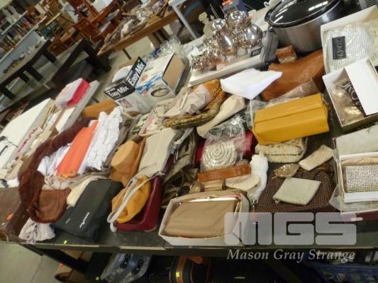 ASSORTED HANDBAGS, PURSES, DOILIES, TABLE CLOTHS, LINEN, ETC, 1 x TABLE