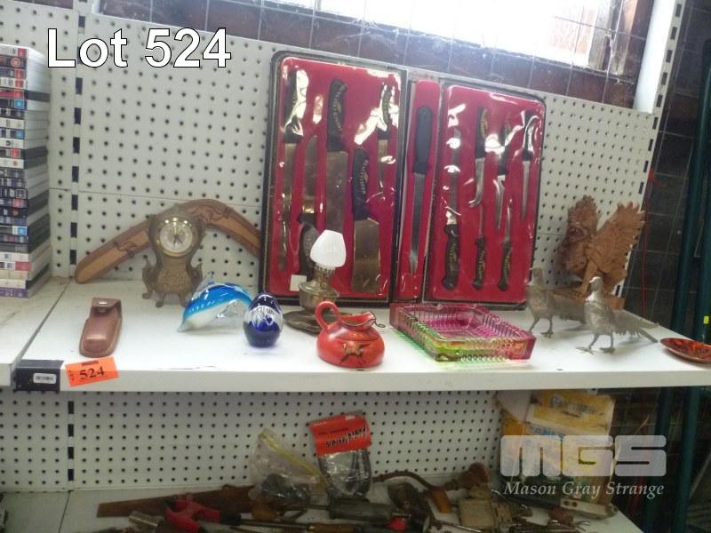GLASS PAPER WEIGHTS, ASHTRAY, MERCEDES MANTLE CLOCK, KNIFE SET, ETC