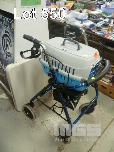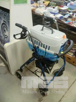 BLUE MOBILITY WALKER, PET CARRY CAGE & FOLD UP TRESTLE TABLE