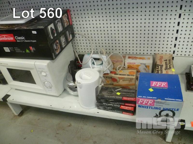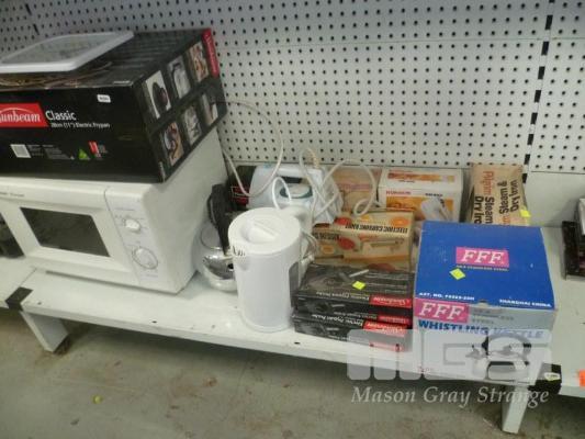 MICROWAVE, FRY PAN, FRY PAN PROBES, MIXERS, KETTLES, CARVING KNIVES, IRONS, ETC, 1 x SHELF