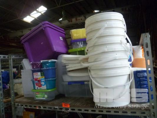 ASSORTED STORAGE CONTAINERS, BUCKETS & PAPER TOWELS, 1 x BAY