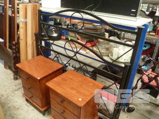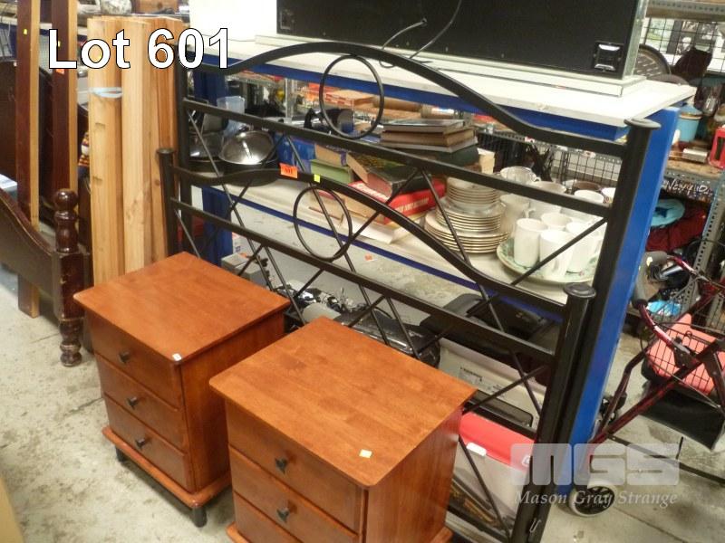 METAL FRAME DOUBLE BED, TIMBER SLAT WITH PAIR TIMBER BEDSIDE CABINETS