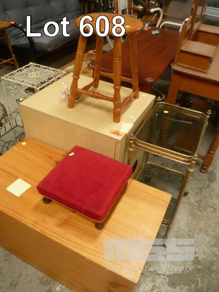 PINE BLANKET BOX, MELAMINE 2 DRAWER FILING CABINET, TRAYMOBILE & 2 x STOOLS