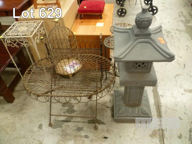 3 x WIRE PLANTER STANDS, WINE TABLE, BIRD CAGE & RESIN STATUE