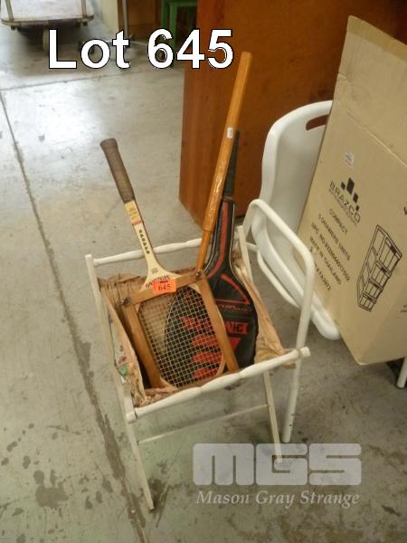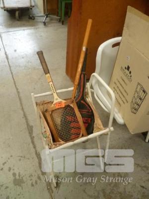 VINTAGE CROQUET MALLET, EMRIK & SPALDING TIMBER TENNIS RACKET & LAUNDRY BASKET